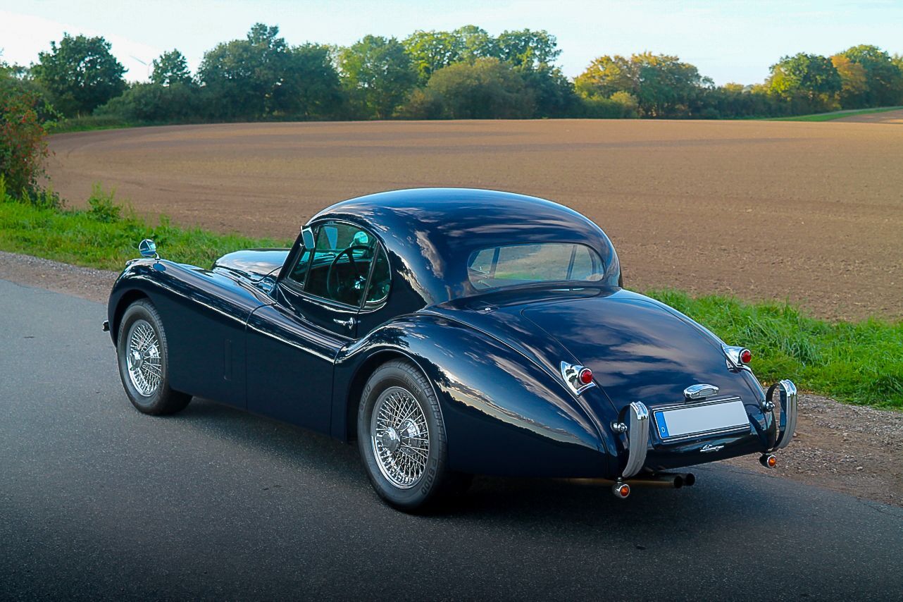 Jaguar XK 120 als zeitlos elegantes Fixed Head Coupe in edlem Pacific Blue mit grauer Vollederausstattung (inklusive dunkelblauer Keder). Colorverglasung Blau. Professioneller Umbau auf Automatikgetriebe vom späten Jaguar XK 150 - optisch und technisch anmutend wie original ab Werk.